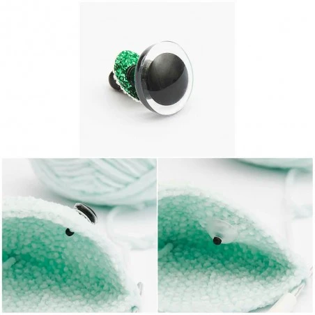 - Fáciles de aplicar: Simplemente coloca el color deseado sobre el eje negro, inserta el ojo en tu proyecto y asegura el cierre de plástico para que quede bien sujeto.