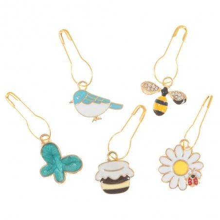 El Pack de 5 Marcadores de Punto Be Happy de Milward incluye 5 marcadores metálicos de color dorado con abalorios de formas divertidas: un pájaro, una abeja, un bote de miel, un lazo y una flor.