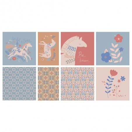- Modelo 1: caballo rodeado de flores de colores y con la frase “Wild & Free” sobre un fondo azul.