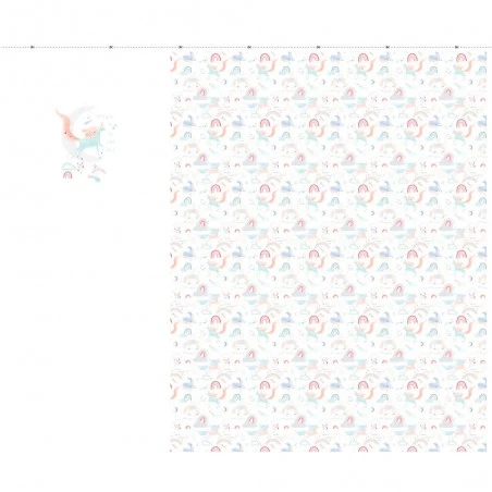 El estampado de esta tela presenta unicornios de colores suaves, con nubes y arcoiris, un diseño mágico perfecto para los niños.