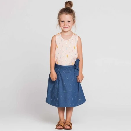 La camiseta propuesta por Katia está confeccionada con la tela jersey Little Indians Feathers y la falda se propone con la tela denim Pioneers Denim.
