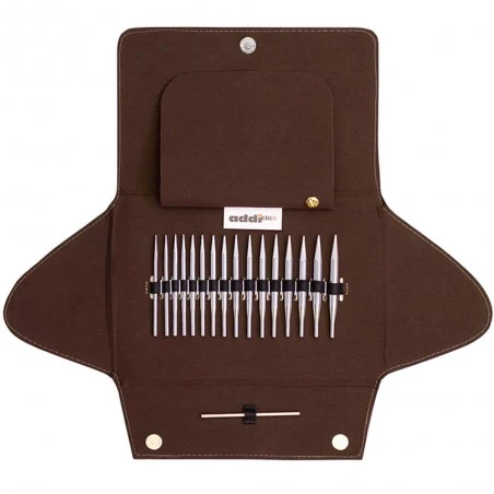 El Set de Agujas Circulares Intercambiables addiClick Lace Short – addi es una opción perfecta para tejedores que buscan materiales de calidad. Este set incluye 8 pares de agujas de 3,5 a 8 mm, 5 cables de 40, 50, 60, 80 y 100 cm, un conector, un addiGrip y un broche dorado, todo ello cuidadosamente organizado en un atractivo estuche marrón.