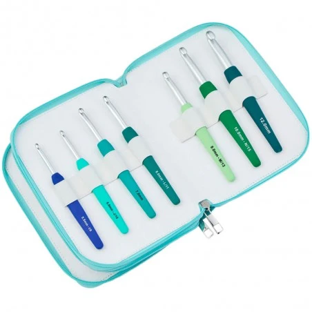 2 mm, 2,5 mm, 3 mm, 3,5 mm, 4 mm, 4,5 mm, 5 mm, 5,5 mm, 6 mm, 7 mm, 8 mm, 9 mm, 10 mm y 12 mm - Ganchillos organizados en un práctico estuche azul turquesa.