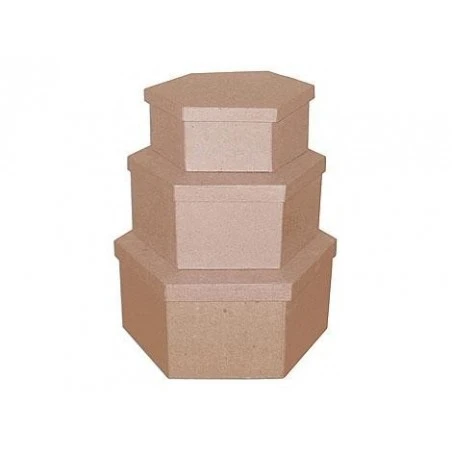 Set de 3 cajas de papel maché de forma hexagonal y con diferentes medidas, perfectas para hacer todo tipo de decoraciones personalizadas.