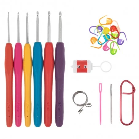 – 6 ganchillos con mangos suaves en tamaños de 2,5 mm, 3 mm, 3,5 mm, 4 mm, 4,5 mm y 5 mm