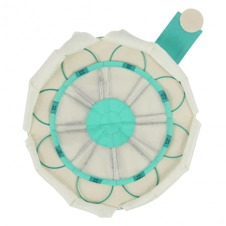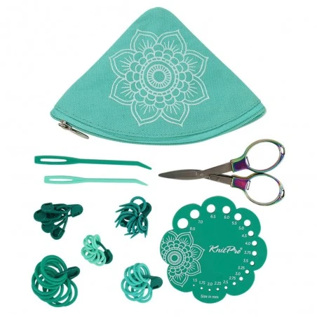 El diseño Explore de la colección Mindful presenta un estuche de color azul turquesa con un estampado mandala. Es de forma triangular y, en cuanto lo abres, toma forma circular para mostrar todas las agujas perfectamente organizadas en su interior.