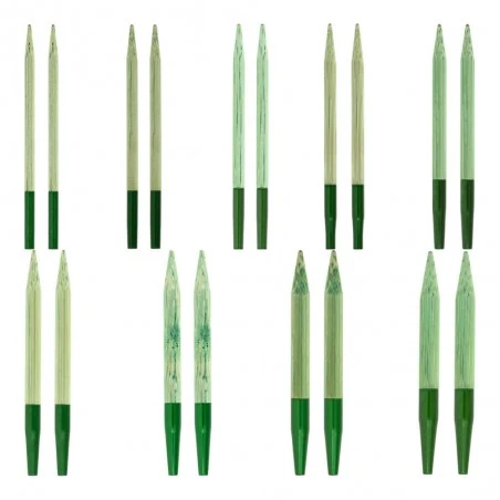 Las agujas cuentan con una longitud de 9 centímetros y están fabricadas en madera de bambú. Son ligeras y manejables, y se pueden unir fácilmente a la longitud de cable que necesites. El diseño resalta las características y la belleza del bambú, con un suave toque en color verde que las hace aún más llamativas.