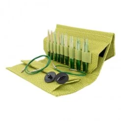 El Set de Agujas Circulares Grove 9 cm – Green Basketweave Effect de Lykke presenta una colección de 9 pares de agujas circulares intercambiables con cables y accesorios para tejer, presentados en un llamativo estuche de color verde.