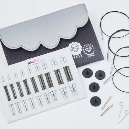 – 9 pares de agujas circulares intercambiables en los grosores: 3 mm, 3,25 mm, 3,5 mm, 3,75 mm, 4 mm, 4,5 mm, 5 mm, 5,5 mm y 6 mm