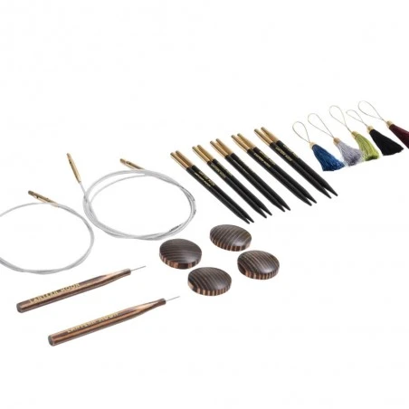 Este set incluye 5 pares de agujas circulares intercambiables en los grosores 3,25, 3,75, 4,0, 4,5 y 5,0 mm, además de 2 cables giratorios de 40 cm y 50 cm. Estos cables están hechos de acero inoxidable recubierto de nylon, y la longitud indicada se consigue una vez que las puntas de aguja se han unido al cable.