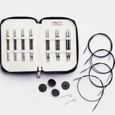 El Set de Agujas Circulares Intercambiables 10 cm Karbonz Special de KnitPro es la elección perfecta para tejedores exigentes. Este juego incluye 7 pares de agujas intercambiables, 4 cables y otros accesorios, todo cuidadosamente guardado en un estuche de tela gris con cremallera para un almacenamiento conveniente.