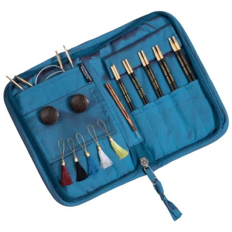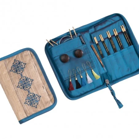 También se incluyen tapas de madera, herramientas de ajuste y marcadores de punto adornados con borlas de colores, brindando funcionalidad y estilo. El estuche está hecho de seda Khadi, con un bordado floral que consigue un diseño elegante. No solo es un reflejo de la artesanía de calidad, sino que también ofrece un espacio de almacenamiento seguro y organizado para todas las piezas del set.
