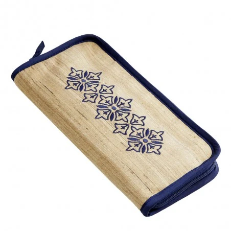 - Estuche de seda con bordado floral. Interior azul con compartimentos y bolsillos.