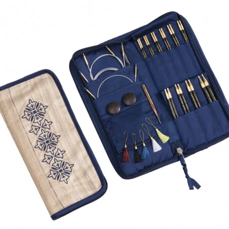 Todos los materiales se presentan organizados en un precioso estuche de seda Khadi, un material indio de importancia histórica. El exterior del estuche presenta un hermoso bordado con motivos florales, lo que le da un aspecto elegante y distintivo.