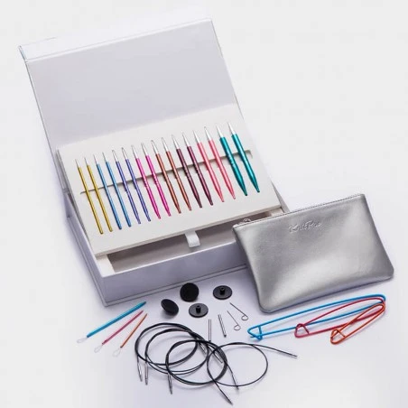 Incluye 8 tamaños de agujas circulares intercambiables Zing en los grosores 3,5, 4, 4,5, 5, 5,5, 6, 7 y 8 mm, además de 4 cables y una variedad de accesorios. También encontrarás un pequeño estuche plateado con cierre de cremallera, perfecta para organizar los pequeños accesorios.