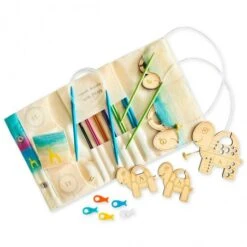 Además, el set incluye marcadores de punto en forma de pez, bobinas de madera de haya en forma de tortuga para sujetar hilos multicolores y un calibrador de agujas con diseño de tortuga grande.