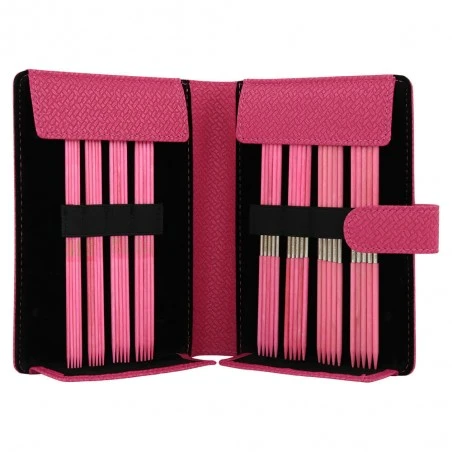 Los dos sets incluyen un práctico estuche de polipiel en color rosa magenta, perfecto para organizar las agujas y mantenerlas protegidas.