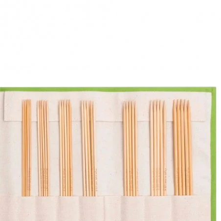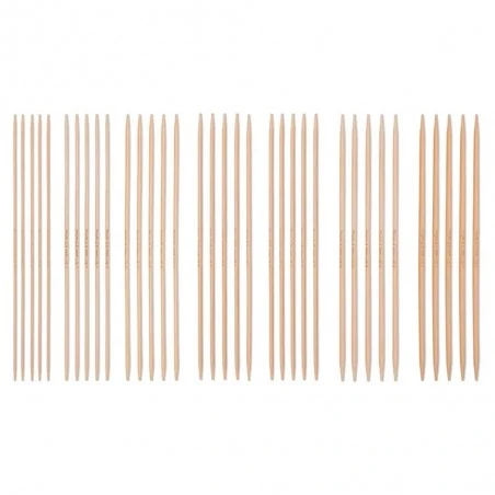 Estas agujas de doble punta están hechas de bambú chino de rápido crecimiento, y son conocidas por sus puntas pulidas y su superficie suave y cómoda. El juego abarca los tamaños más populares de agujas, desde 2 mm hasta 4,5 mm, lo que lo hace ideal para trabajar con una variedad de grosores de hilos. Los tamaños están claramente impresos en el centro de cada aguja, facilitando su identificación.