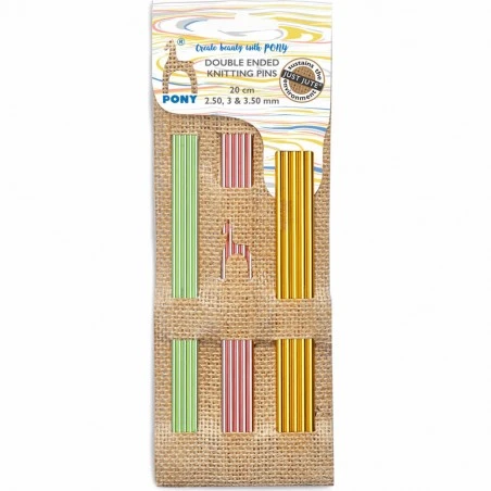 El Set de Agujas de Doble Punta 20 cm de Colores con Estuche de Yute de Pony presenta un pack de 3 juegos de tamaños diferentes. Lo tienes disponible en las medidas: 2,5 mm, 3 mm y 3,5 mm o en las medidas: 4 mm, 4,5 mm y 5 mm. Cada pack incluye 5 agujas.