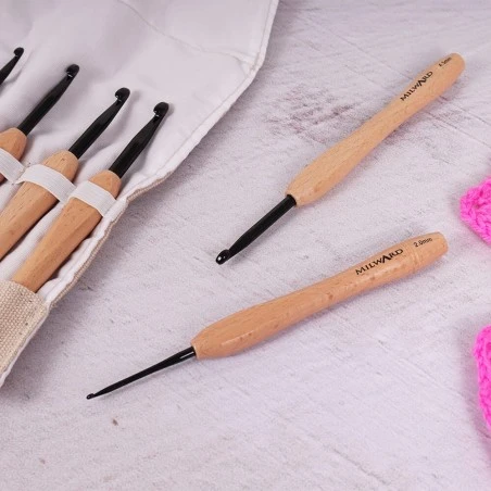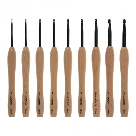 El Set de Ganchillos con Mango de Madera de Haya de Milward fusiona elegancia y funcionalidad para ofrecer una experiencia de tejer única. Este juego de 9 agujas de ganchillo con puntas de aluminio en color negro presenta mangos de madera de haya, cálidos y suaves al tacto, proporcionando una comodidad excepcional durante tus proyectos creativos.