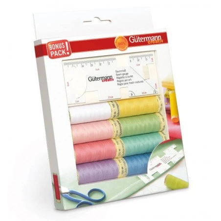 El Set de Hilos Coselotodo 100 metros +Regla para costuras– Gutermann ofrece una regla para costuras para marcar de forma rápida y sencilla las costuras y dobladillos de su prenda. Se trata de una herramienta práctica y de fácil manejo en plástico ligero y flexible.