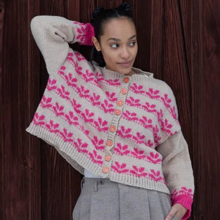 - Berry Bushes: Cárdigan extragrande con bloques de color en la cintura y un hermoso patrón de hojas. El cárdigan se teje en plano, sin costuras, de arriba hacia abajo. Tiene mangas raglán largas y forma cuadrada sin cintura.