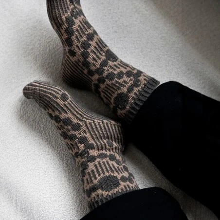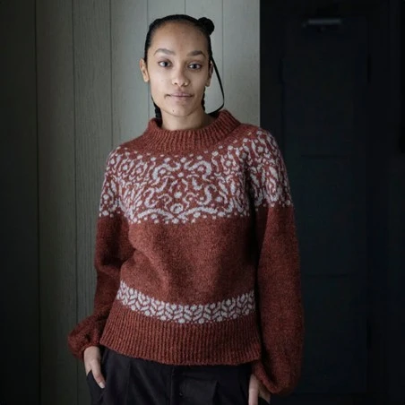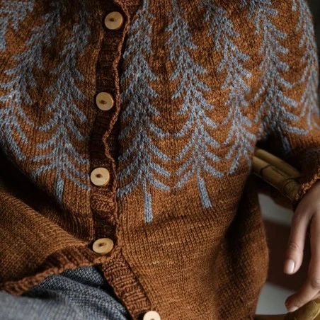 - Deep Roots: Suéter se teje de arriba hacia abajo sin costuras, comenzando por un cuello vuelto alto trabajado en brioche de dos colores y continúa con un canesú redondo adornado con un patrón de colores vegetales. Los puños se trabajan en brioche bicolor.
