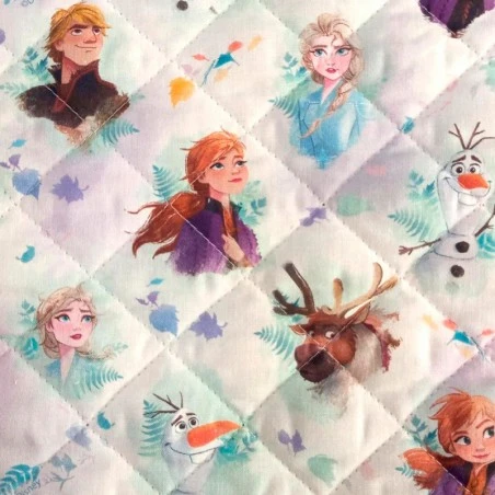 La Tela Acolchada – El Reino del Hielo – Frozen es perfecta para confeccionar un juego de cama para una habitación infantil. El tejido está formado por 3 capas de tela: una capa exterior con el estampado de Frozen, una capa intermedia de acolchado grueso y una capa interna.