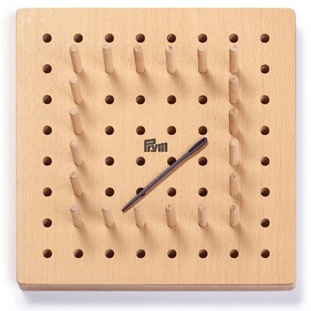 - Un tablero de 18 x 18 cm, con 64 agujeros donde podrás colocar tú mismo las clavijas para tejer la pieza que desees.