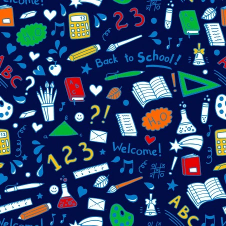 Presenta un estampado de accesorios escolares, como libros, lápices, bolígrafos, pinceles, reglas, calculadoras, fórmulas químicas, notas musicales y otros motivos inspirados en las diferentes asignaturas del colegio.