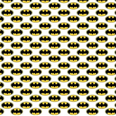 Se trata de una tela de color blanco, con un estampado del logo de Batman, el famoso superhéroe de comic caracterizado como un murciélago. ¡Un diseño perfecto para los amantes de los comics y los superhéroes en general!