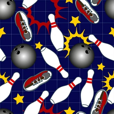 La tela de algodón Bolos presenta un diseño divertido con bolas, bolos y calzado para jugar. El fondo de la tela es de un color azul marino, y los motivos destacan sobre él.