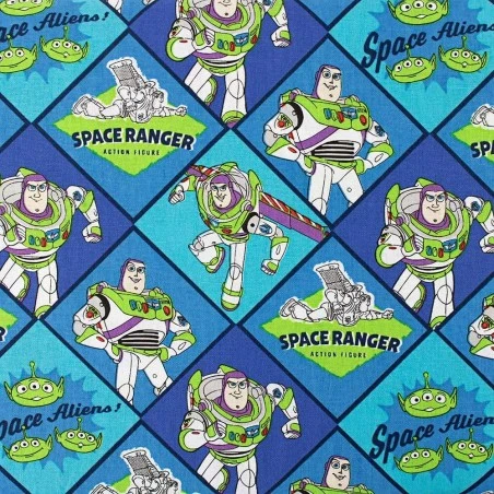 La tela se presenta en diferentes tonos azules con estampado de Buzz Ligthyear de la película Toy Story.