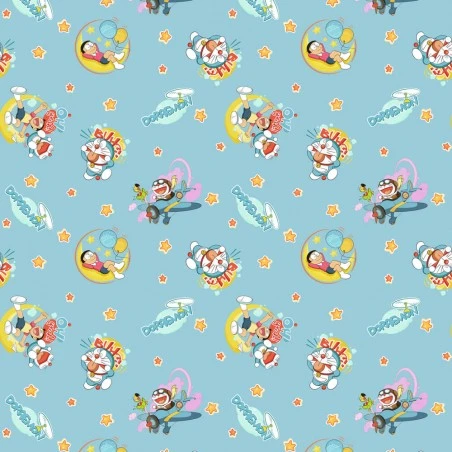 El fondo de la tela es de color azul cielo y presenta un estampado inspirado en la serie de dibujos animados “Doraemon”. Encontrarás a los personajes principales, Nobita y el famoso gato cósmico, viviendo aventuras por todo el mundo.