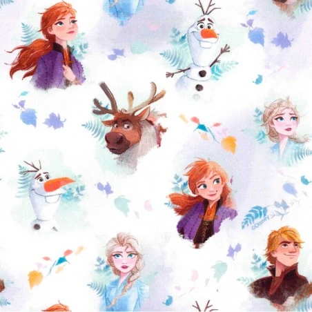 Lo mejor de esta tela es su diseño, basado en los personajes de la película Frozen. Presenta un bonito estampado de Anna, Elsa, Olaf, Kristoff y el reno Sven, sobre un fondo blanco óptico. ¡Es la tela ideal para los fans de esta película de dibujos animados!