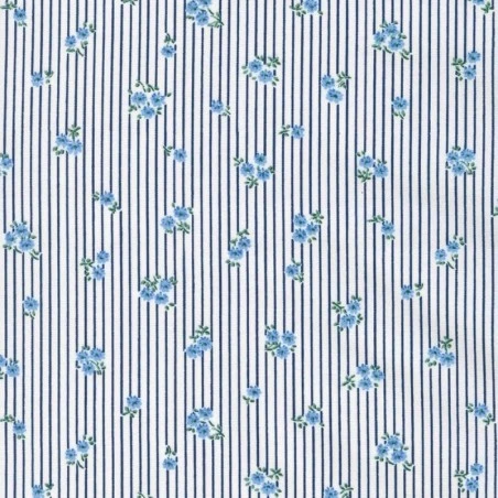 Las delicadas florecitas, con dimensiones que oscilan entre 0,2 cm y 0,4 cm, se entrelazan con gracia entre las rayas, añadiendo un toque encantador y detallado a la tela. Con un ancho aproximado de 110 cm, esta tela proporciona la amplitud perfecta para tus creaciones.