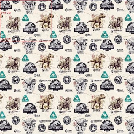 Si eres un fanático de los dinosaurios, el diseño de esta tela te fascinará. Está inspirado por la película Jurassic World, con un estampado estilo vintage de diferentes tipos de dinosaurios y del logo de la película. ¡Tanto a niños como a mayores les encantará!