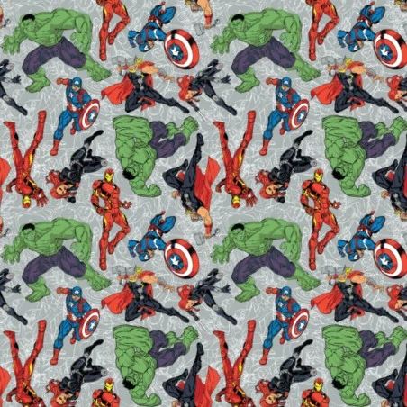 Cuenta con un estampado de Superhéroes de Marvel, donde podrás encontrar a Hulk, Capitán América, Thor, Ironman y La Viuda Negra. El fondo de la tela es de un color gris suave.