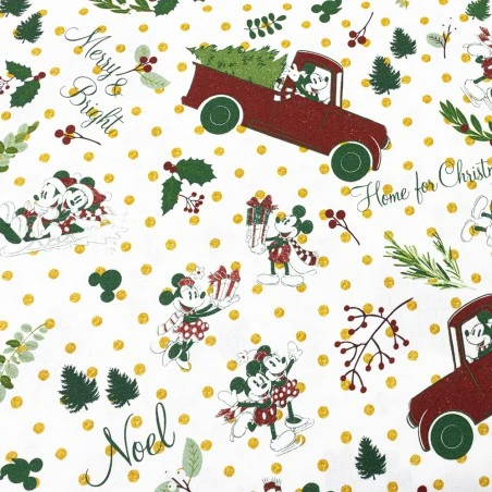 El fondo de la tela es de color blanco, y presenta un estampado de Mickey y Minnie Mouse celebrando la Navidad en familia: podrás verlos recogiendo el árbol, dándose los regalos, abrazándose… ¡Celebra la Navidad con tus personajes favoritos de Disney!
