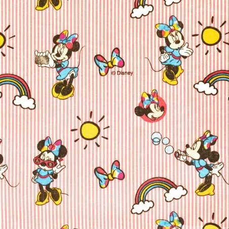 - Diseño: estampado de Minnie Mouse sobre un fondo de rayas blancas y rosas