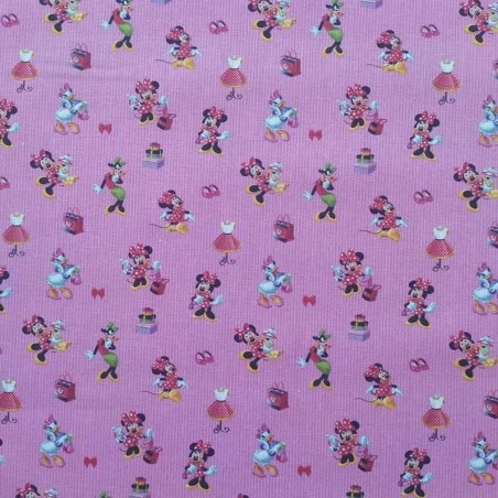 - Diseño: tela rosa con estampado de Minnie Mouse y sus amigas de compras