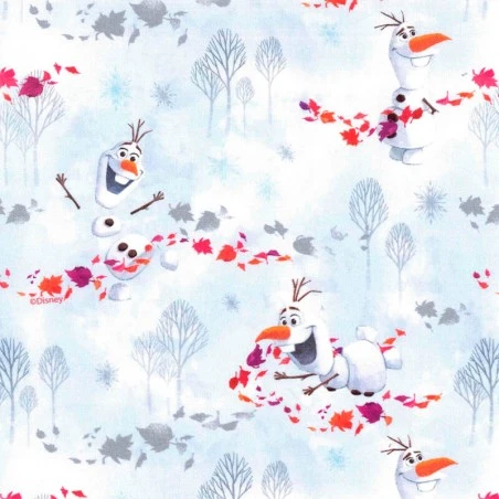 Presenta un diseño inspirado en la película Frozen, y más especialmente en el personaje Olaf, el famoso y divertido muñeco de nieve, amigo de Elsa. Es una tela en tonos blancos, grises y rojizos, sobre un fondo también blanco.
