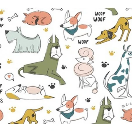 Presenta un estampado de perros de distintas razas sobre un fondo de color blanco. Este diseño la hace perfecta para confeccionar accesorios para nuestras mascotas. Puedes utilizarla para crear una colcha para perros, un almohadón, una camita para nuestros cachorros, una casa de tela y otras ideas divertidas.