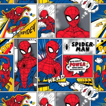 La tela de algodón Spiderman – Comic presenta un estampado de viñetas de este superhéroe de Marvel. Podemos encontrar a Spiderman con diferentes posiciones en cada viñeta.