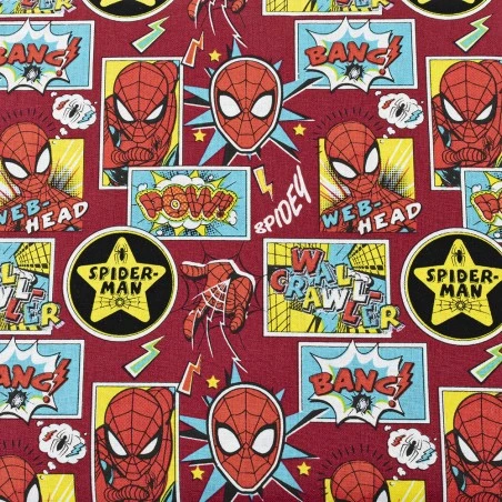 La tela de algodón Spiderman Outside in the Box presenta un estampado con diferentes sellos de este personaje característico de Marvel. El estampado muestra a Spiderman en diferentes situaciones en viñetas simulando un divertido comic. ¡Encantará tanto a niños como a mayores!