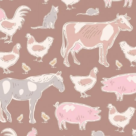 - Diseño: animales de granja en colores pastel sobre un fondo marrón.