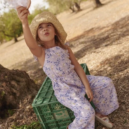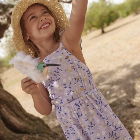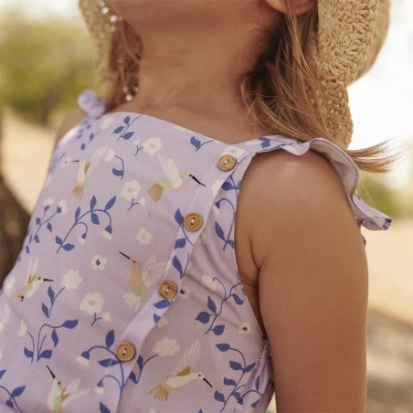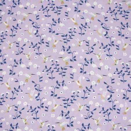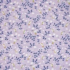 La tela es de un color malva suave, sobre el que destaca un estampado de flores en tonos azul, blanco y amarillo.