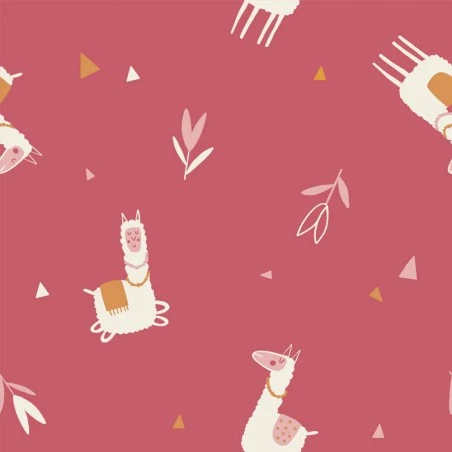 El estampado de este tejido es muy original, y consiste en diferentes llamas paseando tranquilamente, sobre un fondo de color rosa. También encontrarás algunas florecitas, y pequeños triángulos en tonos rosas, blancos y dorados.
