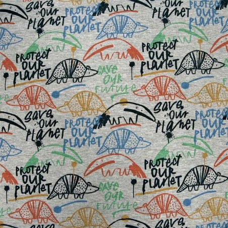La Tela Jersey Melange Katia – Anteater Graffiti es un tejido de punto tipo camiseta que presenta un divertido diseño de osos hormigueros y grafitis en una gama de colores vibrantes, sobre un fondo gris melange. Esta tela de punto jersey ofrece una opción perfecta para crear prendas cómodas y a la moda.
