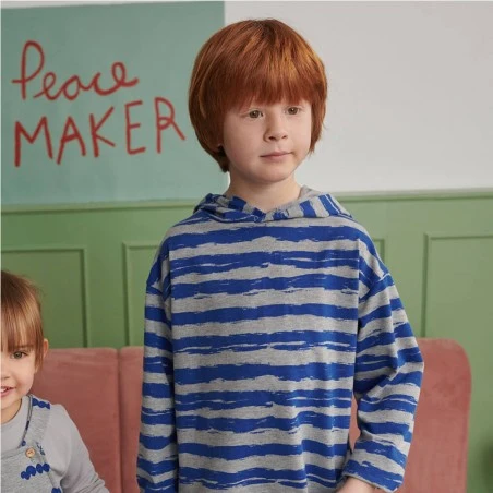 La tela jersey melange Katia Peace Maker Stripes presenta un diseño de rayas anchas sin definir, con efecto pincel que combinan los colores azul y gris.